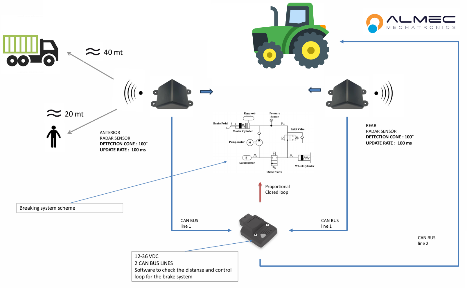 The control software uses a proportional closed-loop command that analyzes the distance from obstacles, calculates the required deceleration, and activates the brake progressively to ensure stability and avoid sudden lock-ups.